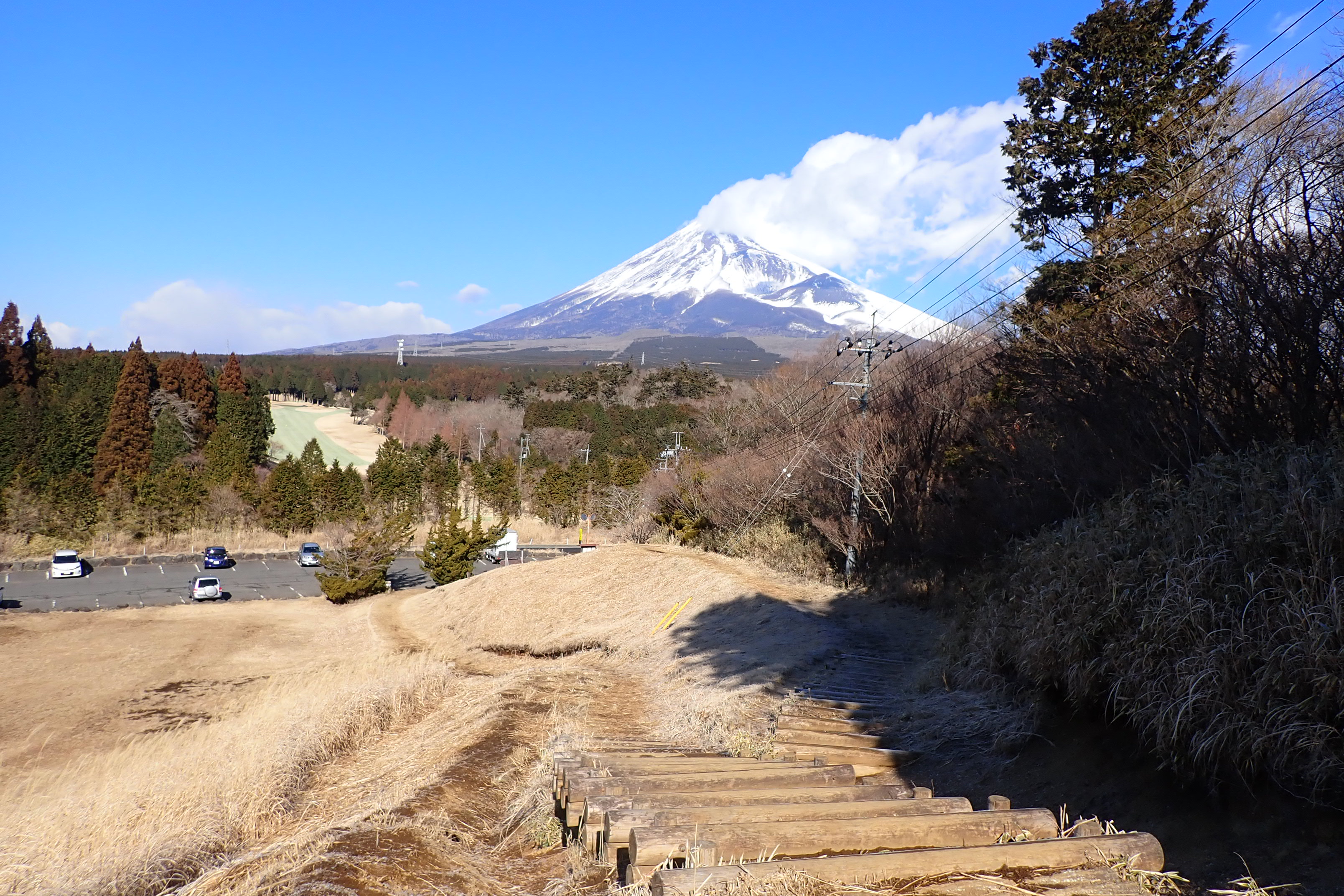 十里木駐車場上がってすぐの登山道 振り返ると十里木駐車場と富士山が