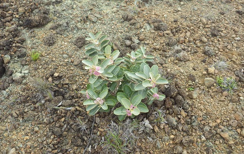 乾いた岩地を好み、葉は少し厚めでしっかりしていて、枝や葉に毛があるのが特徴です。花期は6月くらいでピンク色の小さなかわいい花を咲かせます。ノヤギやネズミの食害もあり、自生株が減少したともいわれ、国内希少野生動植物種にも指定されています。
