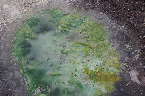 では3枚目の写真、黄緑から緑色これはいったい何でしょう。緑色だから植物っぽいですね。でも待ってください。温泉だから水温高いですね。湯元温泉は弱いけど酸性です。こんな水の中で生きられるのでしょうか?