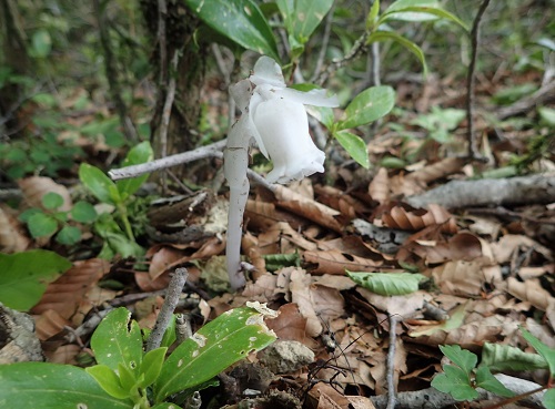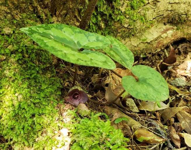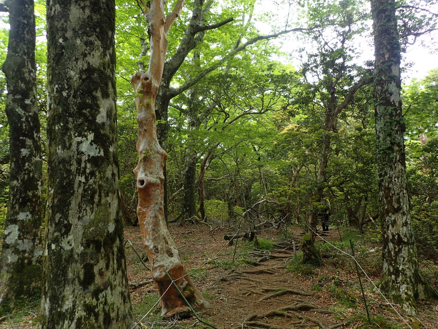 シャクナゲの他にも、透き通るような白さで目を引く腐生植物のギンリョウソウや、一見花はどこにあるの?と思ってしまうランヨウアオイも見ることが出来ました。ランヨウアオイは葉柄の付け根に花をつけるので目立ちませんが、葉を覗き込むと3㎝程の花を見ることが出来ます。葉に白斑がないものもあるようです。