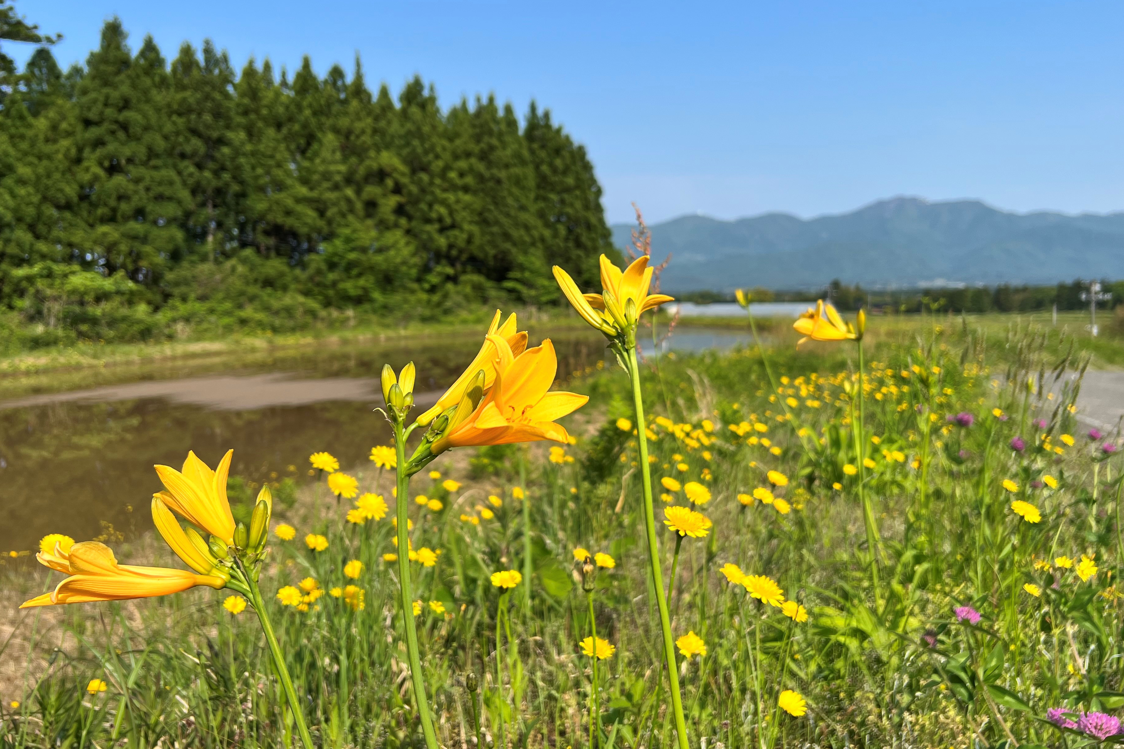 事務所近くの田んぼの畦にはトビシマカンゾウの花が咲き、初夏の景色が広がっています。