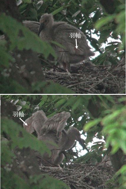 佐渡トキ保護センターの獣医師に日齢を見極めるポイントを改めて伺ったところ、一番わかりやすい判断基準は、羽軸から出る羽の房の大きさの違いとのことでした。