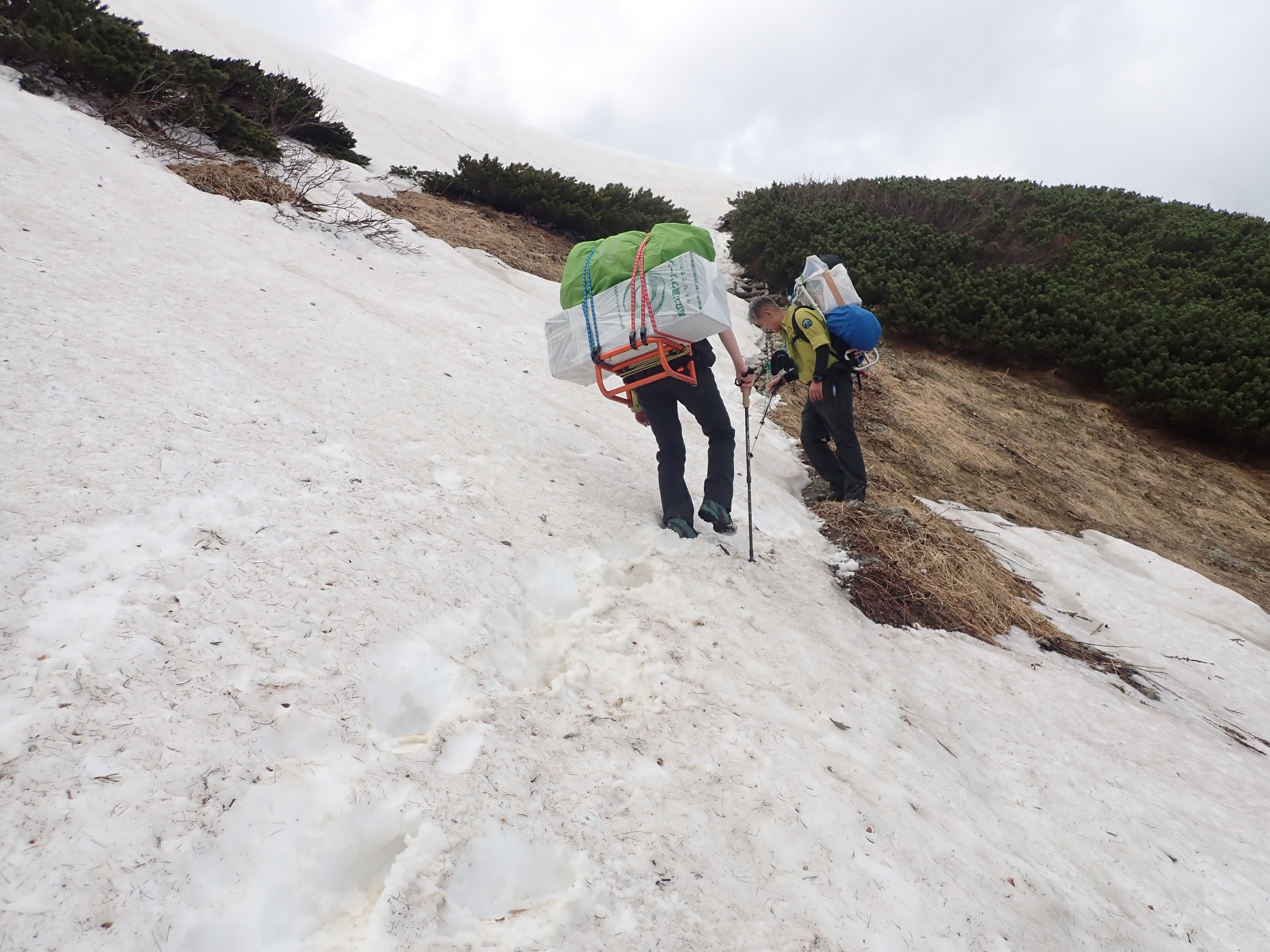 6月10日から11日にかけ、北岳のキタダケソウ生育地の巡視とライチョウ保護対策資材の歩荷に行ってきました。保護官と私・海藤AR(アクティブレンジャー)3名での山行です。海藤ARは初めての北岳です。