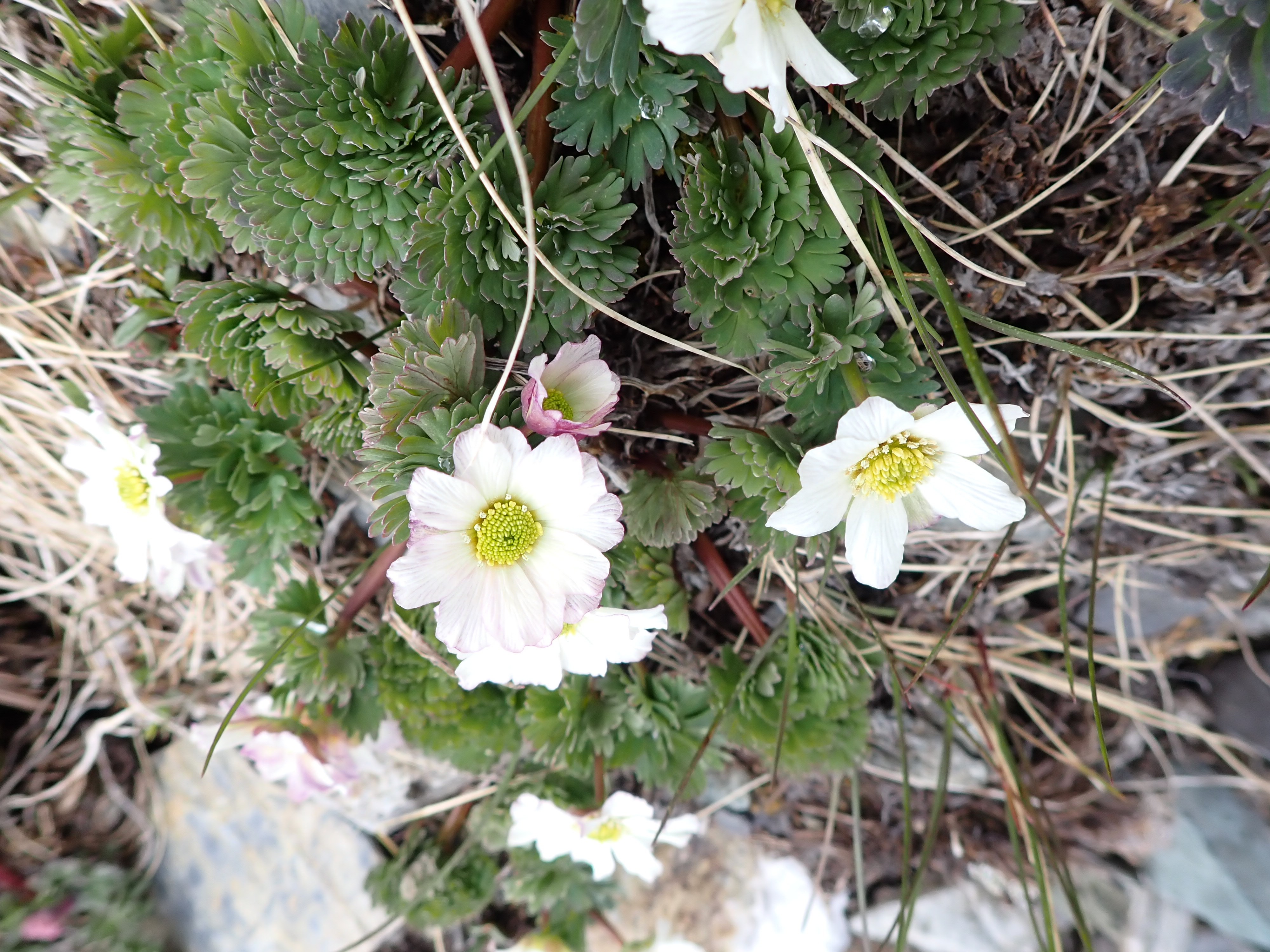 ○キタダケソウです。氷河期からの生き残りの絶滅危惧植物で、北岳だけに咲くキンポウゲ科の花です。日本の近縁種は北海道のヒダカソウとキリギシソウなどがあります。美しい花ですが高山の厳しさに耐える強さも感じますね。満開に近づきつつある状況でした。