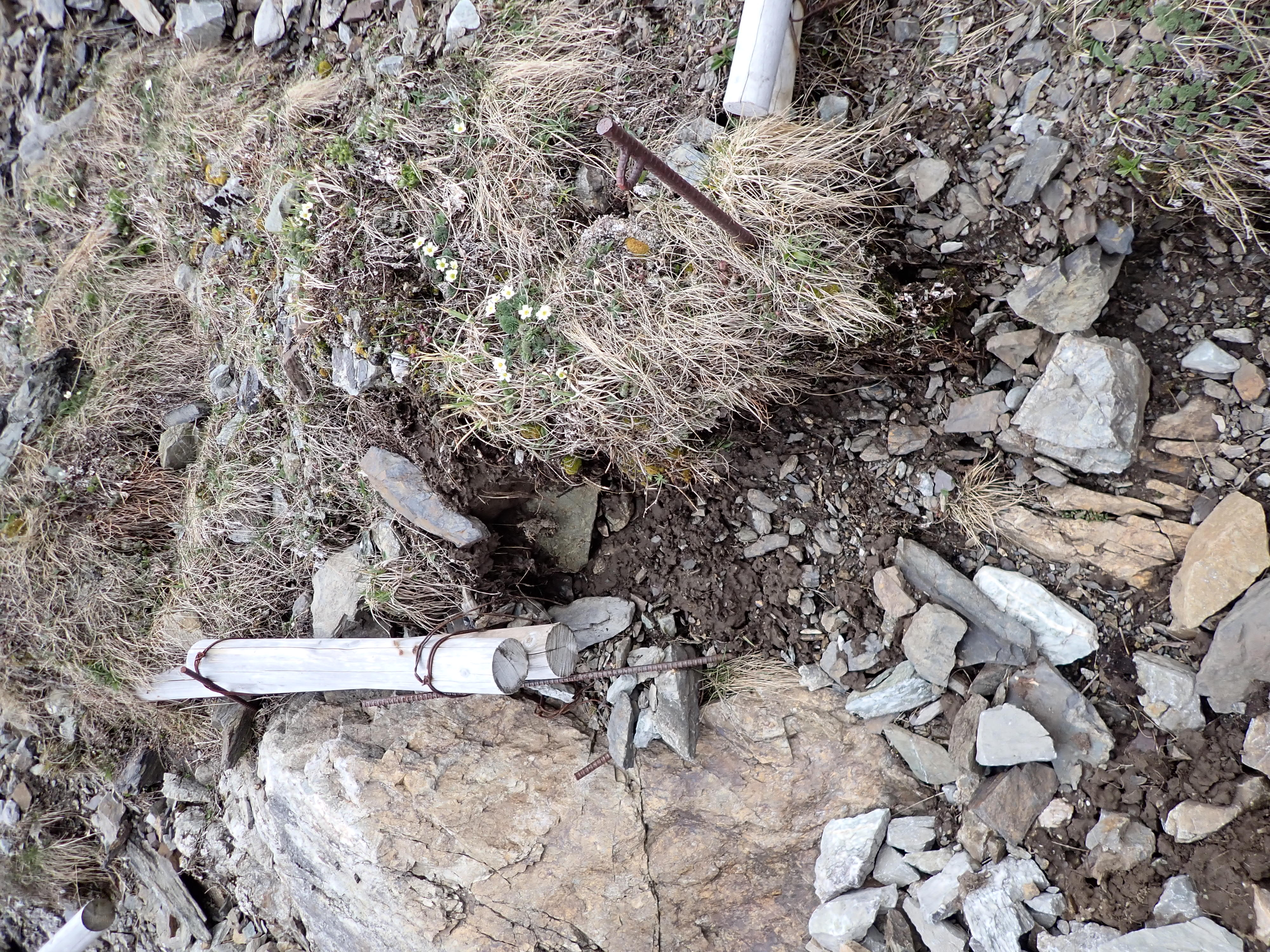 ○写真左側のマルタは土留めのものですが上部からの落石等で壊れてしまい、雨や風雪等で地表面がえぐられ写真右側のキタダケソウ下の土も浸食しています。落石により生育地が分断されている箇所もありました。