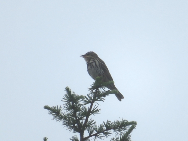 樹のてっぺんでものすごい早口で激しく鳴くこの鳥はビンズイ。夏の繁殖期になるとオスたちはこぞって自分たちの縄張りを主張して「ピピピ、ツィーツィーツィー」と鳴きます。時には囀りながら樹から樹へと飛び移ったり、それはもう大忙し。息が切れたりしないのかなぁ。恋の季節の男子諸君は大変なのです。