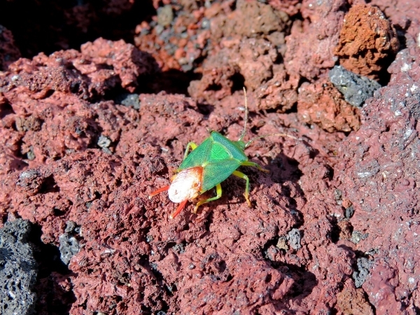 富士山の山頂。こんな所にいきものなんているのかなぁと足元をふと見てみると、ヒメハサミツノカメムシがいるではないですか。ハサミを持つのはオス。交尾の際にメスを挟んで逃がさないようにするためなのです。でも何故わざわざ出会いの確率の低そうな富士山頂まで苦労してやって来るのでしょう? 不思議です。