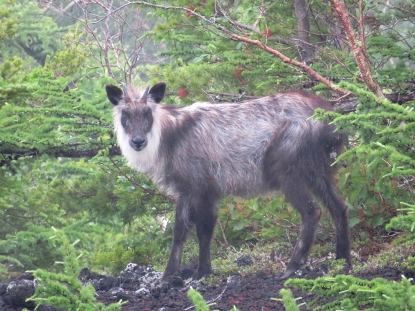 以前に御中道でカモシカに遭遇したのは4年前。その時の個体とは毛並みが違うし、こちらはだいぶ老齢ないぶし銀の様相です。ここ数年のシカの五合目への進出によって生息環境が厳しくなりつつある中で、頑張って生き抜いています。富士山中腹の自然をずっと見守って来た彼らの目には何が映るのでしょうか?