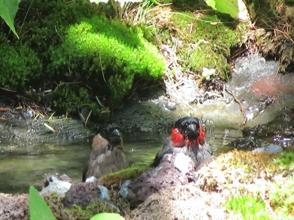 奥庭の水場でウソ(鷽)のつがいが水浴び。鳥は水浴びすることで、羽根や羽毛の間にたまった油分や埃などの汚れ、寄生虫を落として、病気予防や健康な体を守っています。洗い流した後は木の枝にとまって羽繕い。身体から出る脂をくちばしで丁寧に羽根全体に伸ばします。野鳥にとって水浴びはとても大切なのです。(ホント)