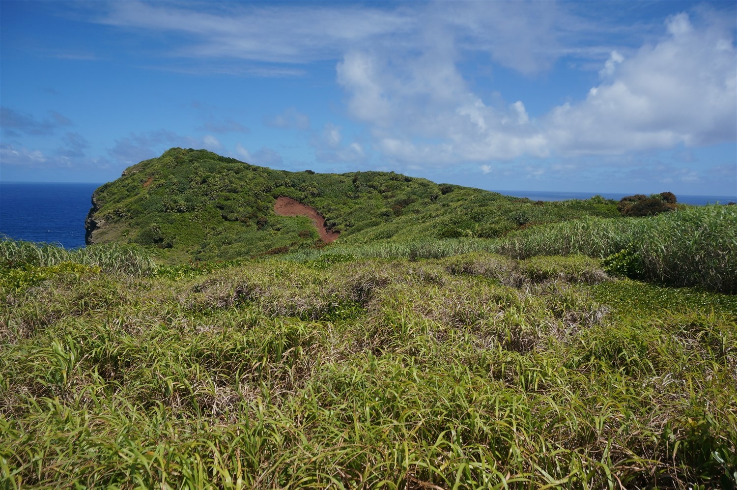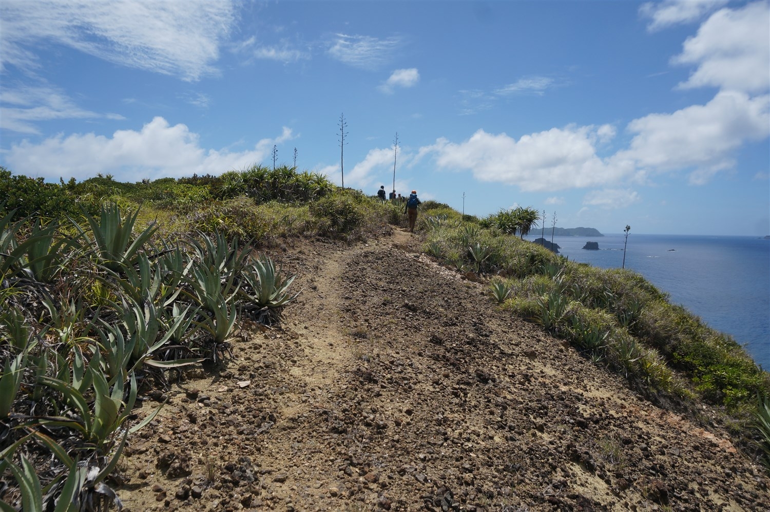 現場までの道のりは、多様な景観が現れます。崖際の急坂やトラバースに始まり、土や岩が露出した裸地、乾性低木林を縫うように進みます。沢沿いにはタマナを中心とした薄暗い森があり、島の東部に至るとオガサワラススキが広がる草原植生が現れます。リュウゼツランがたくさん花や実をつけている様子、赤色の砂が露出した裸地がパッチ状にいくつか広がる景観は、姪島に独特な雰囲気を与えています。一方、植物の基本構成は小笠原諸島全体で大きく変わらないためか、普段私が父島列島で見ている植物種も多く見られたのは興味深かったです。