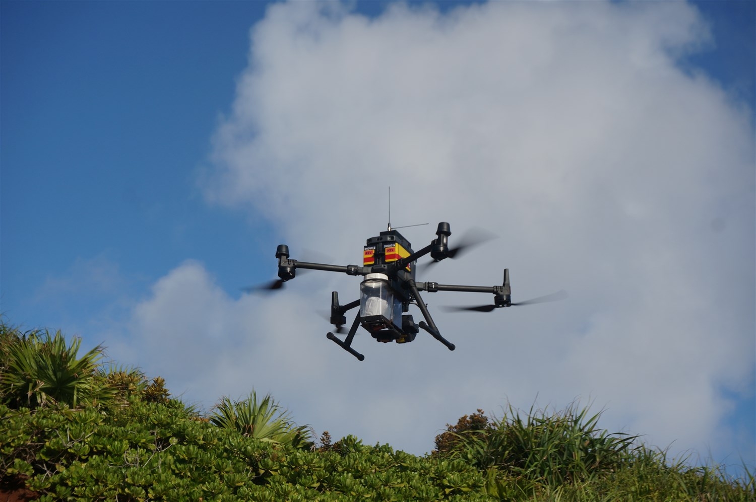 サポート役は、バッテリーや殺鼠剤の運搬のほか、殺鼠剤散布装置への装填、船との無線連絡などを担当します。ドローンは姪島島内から離発着しますが、送信機とドローンの間に障害物がある場合、操縦が不可能になるため、海岸沿いを飛ばす場合、陸地から離陸させた後に操縦権限を船上の操縦者へ移し、そこからドローンに搭載したカメラの映像を確認しながら散布地点に投下をします。