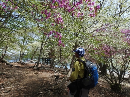 次の見所は、中禅寺湖北岸「冠岩~赤岩」の区間です。今年は今までにないほどのツツジの当たり年だそうで、濃い桃色のトウゴクミツバツツジ、真っ白な花弁のシロヤシオが満開に咲いていました。ツツジは歩道の上を覆うように咲き乱れており、まるで花のトンネルのよう。満開の2種の他にもヤマツツジの朱色のつぼみがそこかしこにあり、次の出番を待っているようでした。