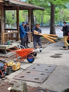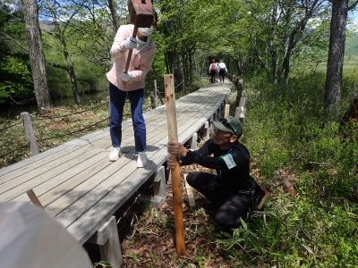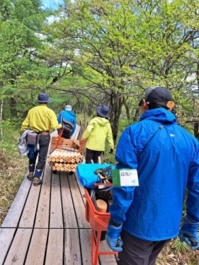 この日の作業は木杭の交換・補修です。この杭は、戦場ヶ原の湿原への立ち入りを防ぐために20年以上前に建てられたものです。今回設置する杭の数はなんと約100本!駐車場までは車で運べるのですが、その先は歩道・木道しかないので、人力で運ばなくてはなりません。背負子やリヤカーを利用して、1.5mの杭100本を目的地まで手分けして運びます。重いし長いしとかなり大変だったようですが、NPVの方は軽々と持ち上げたりロープで結んだりとお手の物。さすがです。