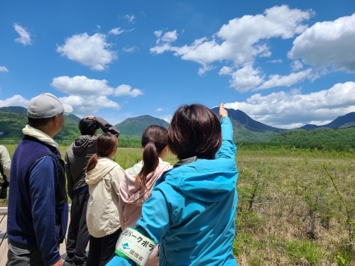 6月上旬の晴れた日、戦場ヶ原に集まったNPVのみなさまたち。またこの日は普段奥日光でガイドをされている方たちにもお声がけして、環境省事務所からも含め、総勢7人の参加がありました。