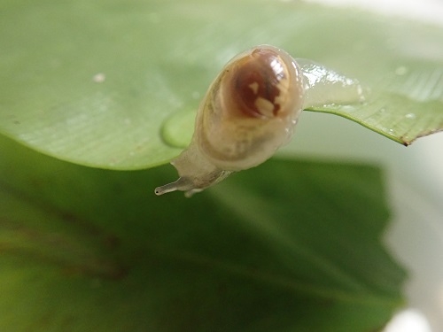半透明のゼリー状のボディに控えめに伸びる触覚、そして小さい笠を背負っているようにみえる殻の部分。なんともいえない愛嬌のある不思議な姿をしており、まさに雨上がりの秘境の山奥で姿を現す妖精のようです。