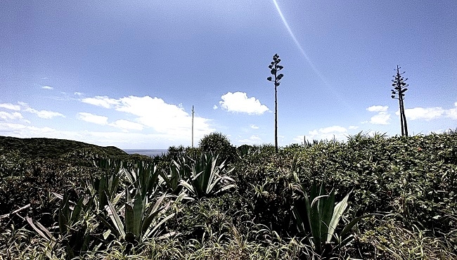 外来種のアオノリュウゼツランが不思議な景観を作り出しています。