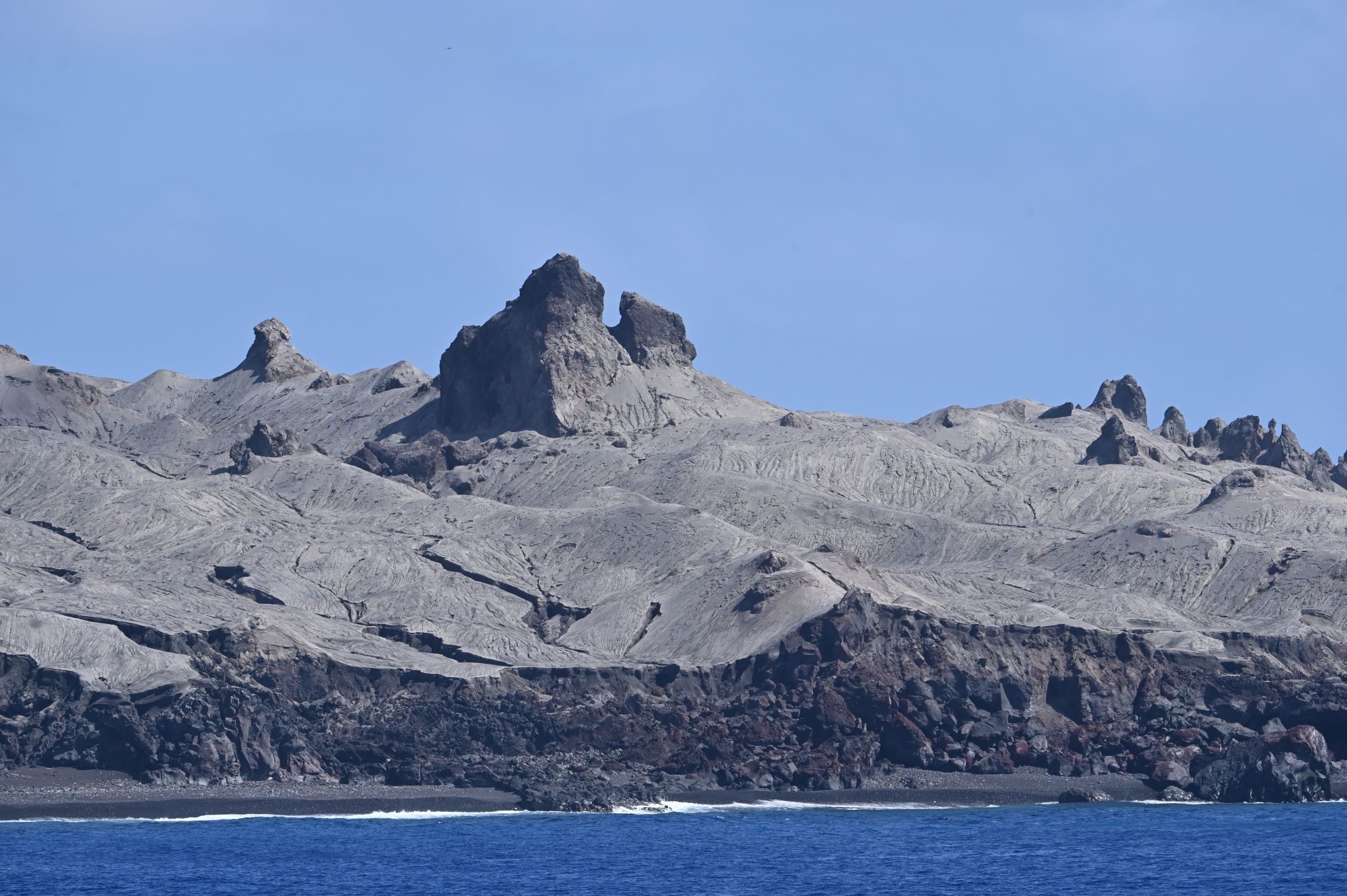 西之島の表面には、いくつもの筋状の模様や深く削れた谷状の地形が見られ、火山の堆積物が浸食されていく様子がうかがえました。西之島は中央部に火口があり、くぼんでいる様子も西側から確認できました。
