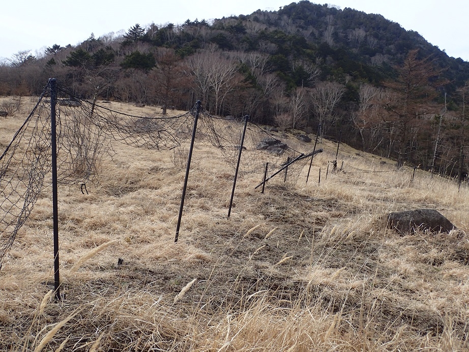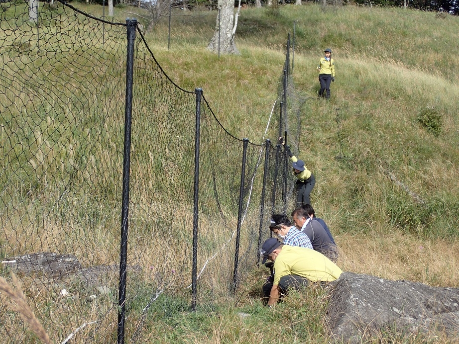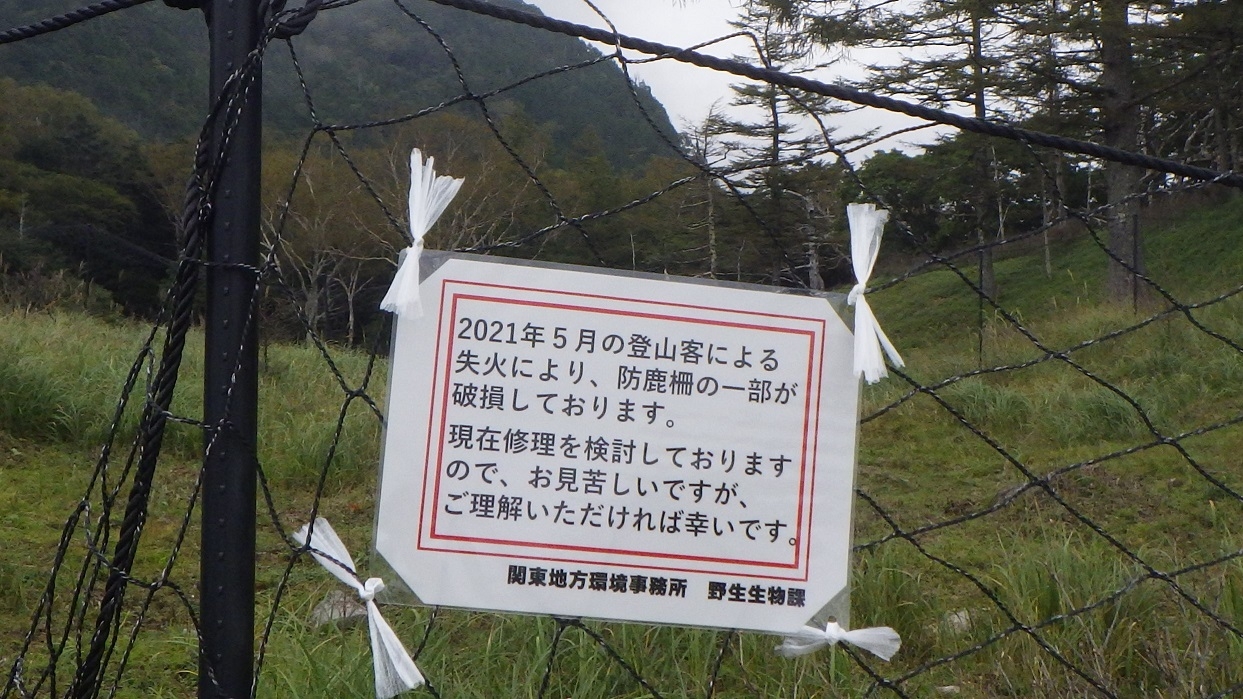 2021年5月に北側斜面の草原一帯が焼失する火災が起き、草原の一部と共に北斜面に設置した植生保護柵の支柱・網等が焼失し、植生保護柵として機能しない上に景観上も好ましくないことから、その修補が急がれていました。