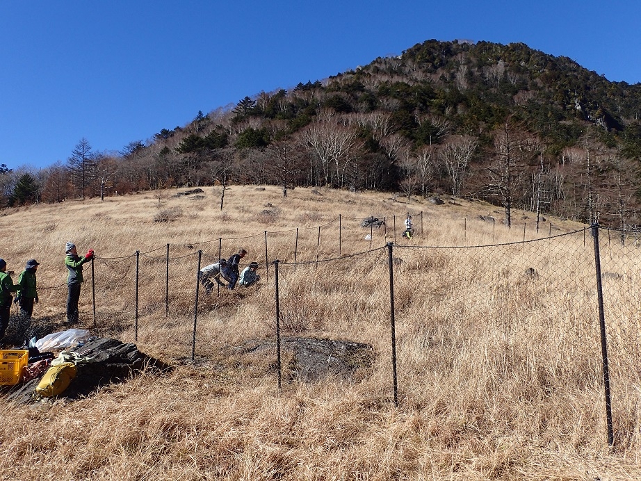 2018年度の関東山地ニホンジカ広域協議会において、植生を保護する必要性の高い乾徳山(山梨県山梨市三富地区 標高2,031m)に、植生保護柵の設置を進めていくことが確認され、2019年に、扇平(標高1,750m付近の草原地帯)の南北の斜面2ヶ所に植生保護柵を設置しました。