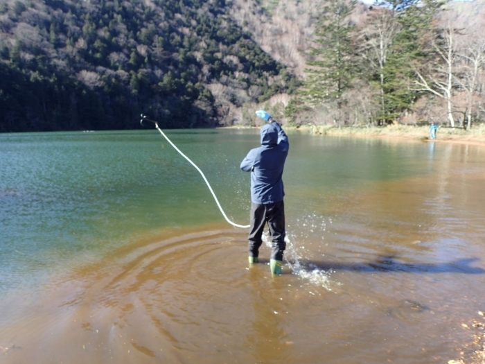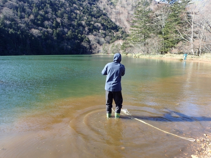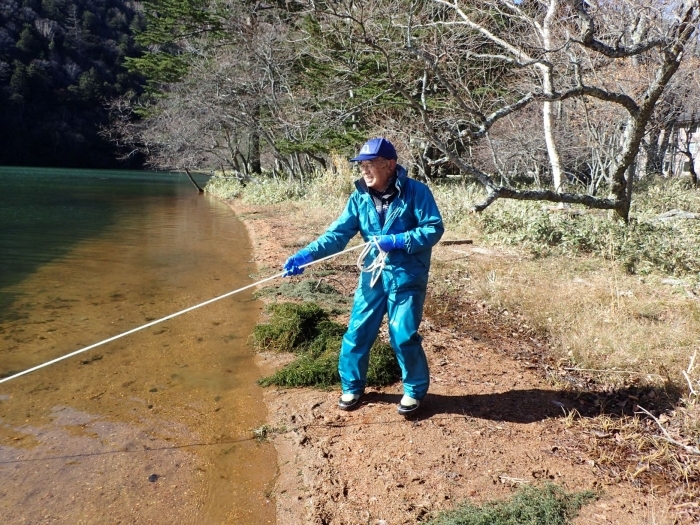 湖畔からの作業の様子です。このような感じで錨を投げ込みます。作業しているのはビジターセンターの職員さんです。