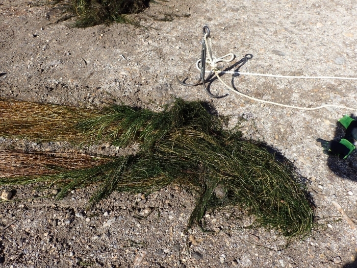 投げ入れた錨と、上がってきたコカナダモです。1回の引き上げで、写真の2倍以上の量が上がることも度々です。沢山捕れると何だかうれしくなりますが、沢山捕れると言う事は沢山生息していることになり、心境としては複雑です。