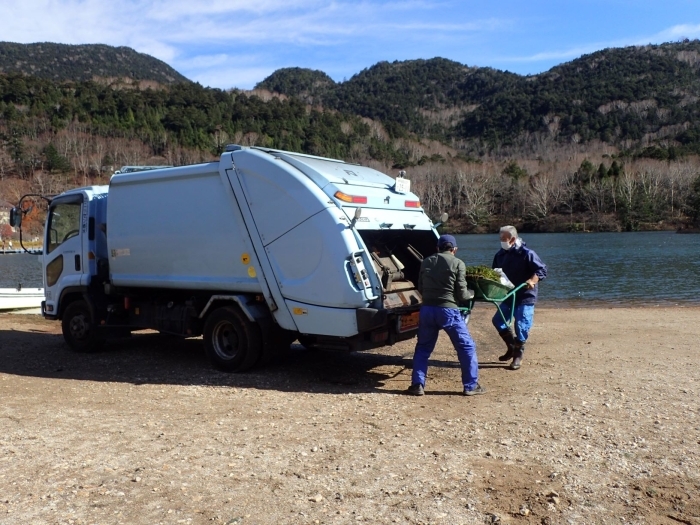 引き上げたコカナダモは、パッカー車で運ばれて行きます。例年の2倍以上捕れたようで、パッカー車の限界まで積み込みました。