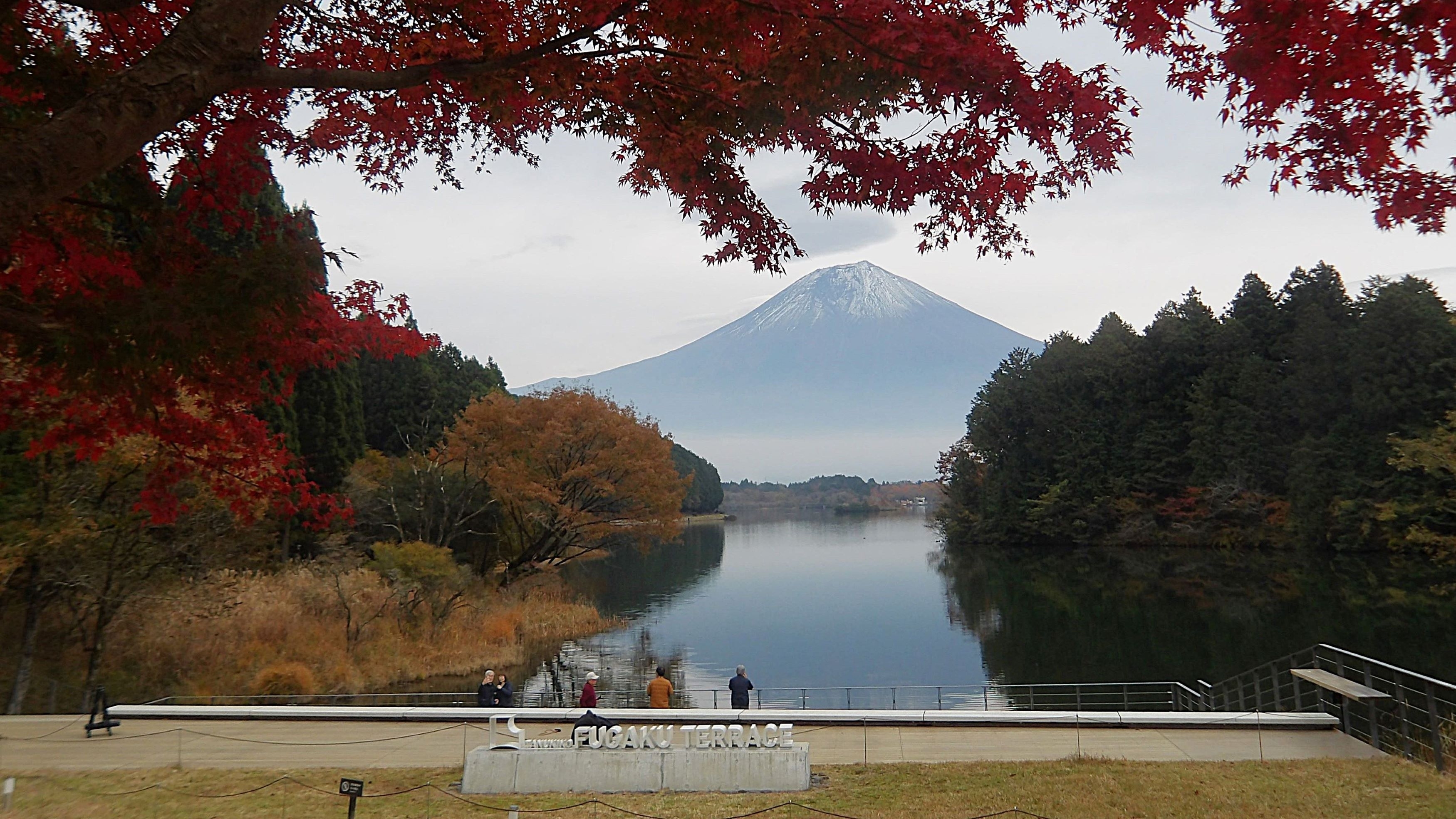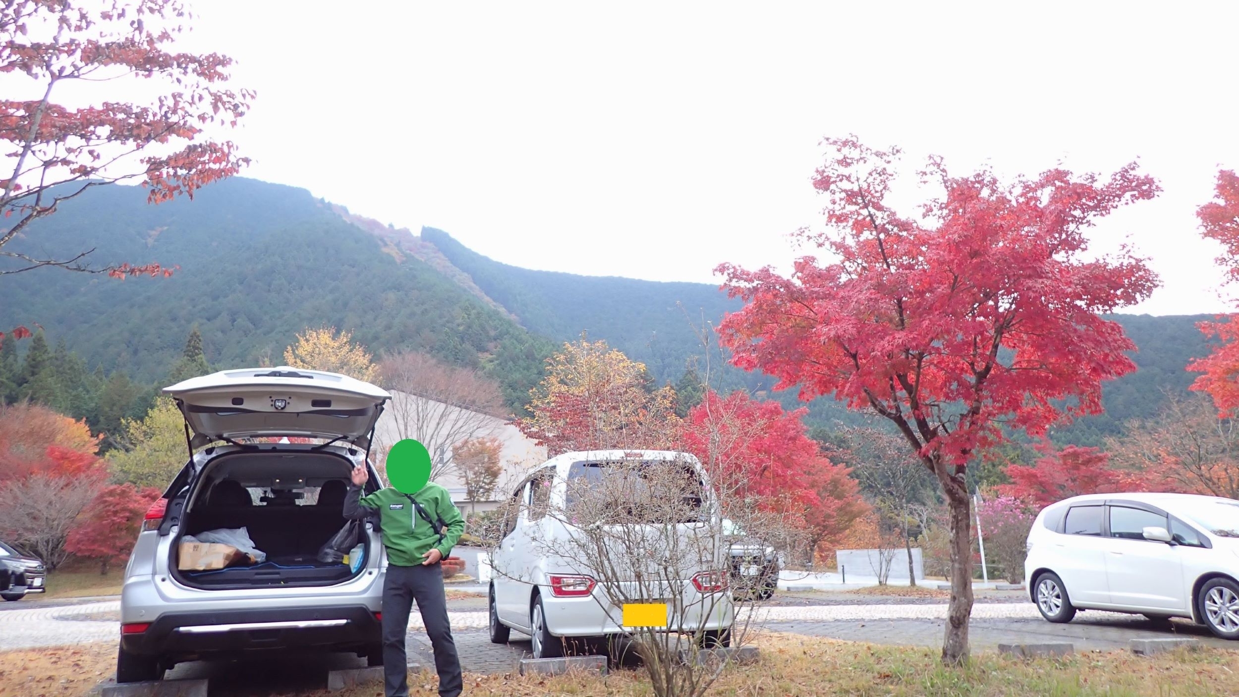 田貫湖の休暇村富士と道を挟んで向かい側にある無料駐車場(以後、“休暇村富士向かいの駐車場”。休暇村富士の敷地内の駐車場は宿泊者専用です。)に車を停めて歩き始めます。この時期は田貫湖周辺の紅葉がとてもきれいです。