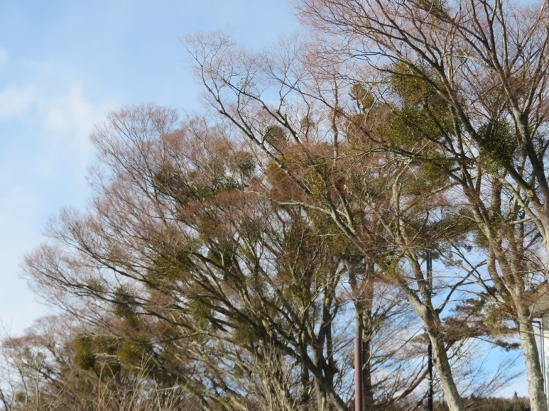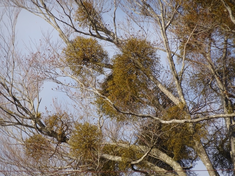 彼らが見つめている目線の先を見てみると、街路樹に緑の玉のような塊が幾つも着いています。ヤドリギです。ヤドリギ(宿り木)は文字通り、自分では地面に根を張らず、他の樹木の枝の上に生育する寄生植物です。そしてよーく目をこらして見ると…。