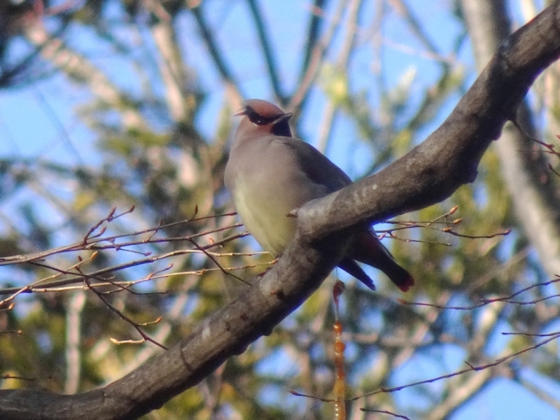 いました!ヒレンジャクです。丸々とした愛らしい体型にシュッとした冠羽がかっこいい、ハンサムな渡り鳥です。尾羽や羽の先端部が赤いのがヒレンジャク(緋連雀)。赤ではなく黄色いのがキレンジャク(黄連雀)ですが、キレンジャクは富士北麓では珍しく、私はまだ出逢ったことがありません。