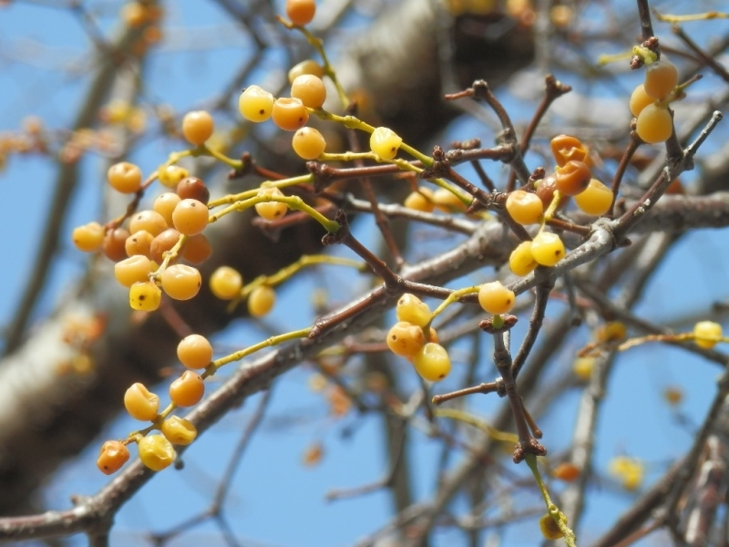 ヤドリギは冬に黄色い実をたくさん付けます。その実はフルーティですが、ねっとりと粘着質でその果肉に種子が包まれています。ヤドリギは寄生植物で、他の樹木の幹や枝に根を食い込ませて成長しますが、一方的に水や養分を奪っているわけではなく自らも葉緑素を持ち光合成をおこなっています。だから、陽当たりの良い樹冠で良く育ちます。