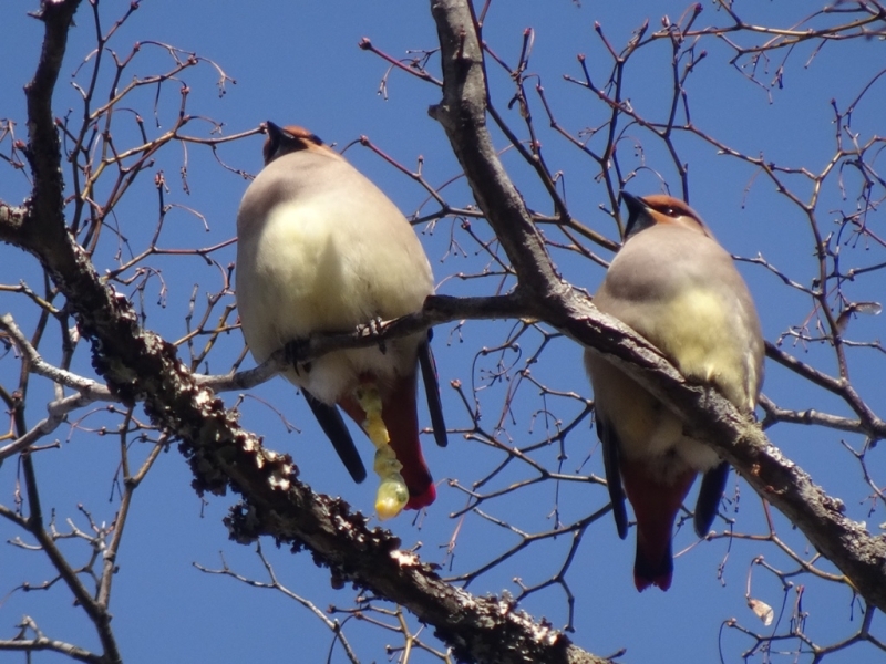 こうやって見ると、ヒレンジャクはヤドリギにいいように操られているように思うかも知れませんが、ヤドリギは結果的にヒレンジャクの渡りのルート沿いに点々と群生を作ることになります。食べ物が少ない冬に渡りをするヒレンジャクにとって、他の鳥にあまり食べられない食糧がルート沿いに確保されているということは彼らにとっても大きなメリットになっているのです。両者にとって相思相愛の素敵な共生関係なのです。