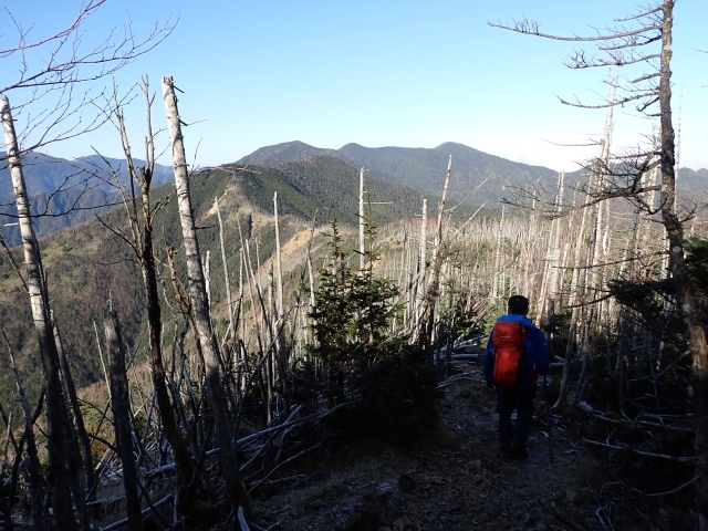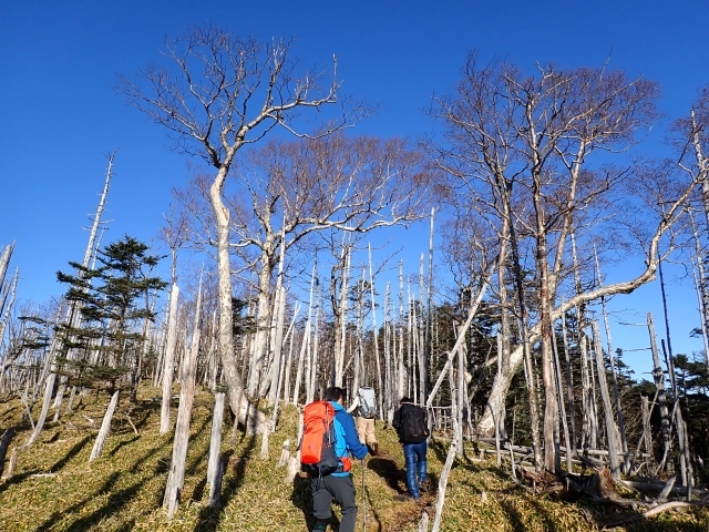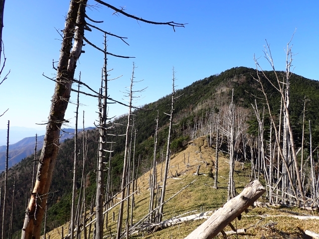 日本三大峠の一つとして知られている雁坂峠から雁坂嶺に向かう稜線では、立ち枯れの木々と背景の青空が印象的です。