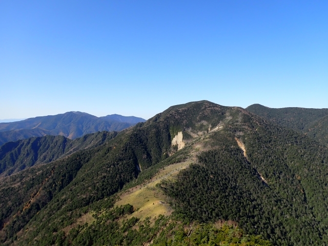 雁坂嶺を過ぎると、木々の間から奥秩父主稜線の一部を垣間見ることができます。