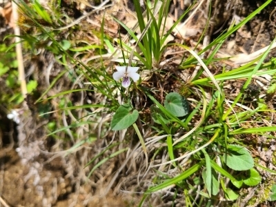 タチツボスミレばかりだと油断していると、時々混ざってくる白いスミレ。タチツボより小さくて華奢に見えます。ニョイスミレとも言うそう。