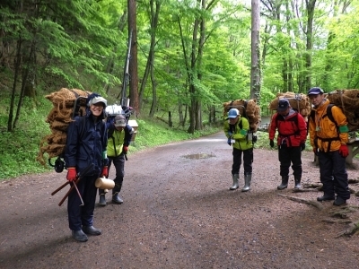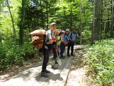 【土嚢を背負子に載せ運びます。】 【天気の良い日もありました。】