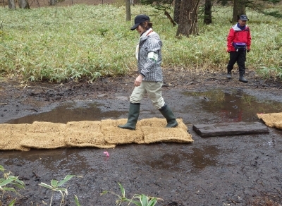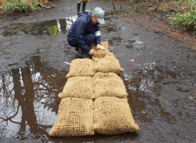 きっかけとなったのは、林野庁の日光森林管理署からの「間伐材の樹皮のチップを使って良いですよ。迂回路に撒けば歩けるようになるのでは。」という話でした。湯川沿いの本来の歩道が歩けるようになれば、迂回路は自然の状態に戻します。自然に戻せるもの、現地にあるものを利用して対策を行うことが必要なので、間伐材の樹皮チップはこの条件に見合う物でした。ヤシ土嚢(ヤシガラ繊維で作られた土嚢で、やがて自然に戻る素材です。)に樹皮チップを詰め、泥濘に敷き詰め歩道を確保する方法を実施しました。