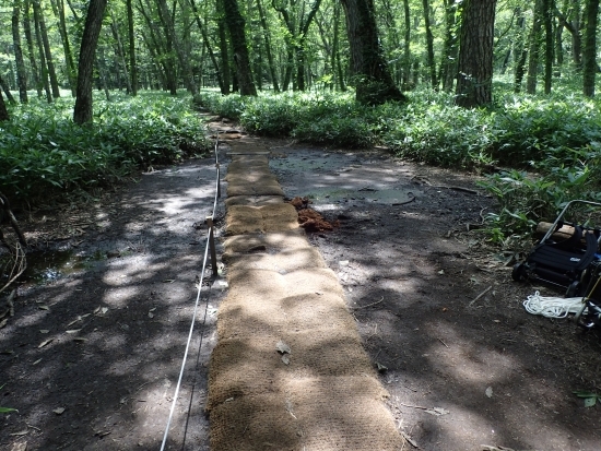 完成はしましたが、間もなくヤシ土嚢は分解していきます。土嚢の状態の確認とメンテナンスを欠く事はできません。NPVのメンバーがいるからこそできる方法ですが、泥濘対策の一つとしてこの方法は有効と考えます。本来の歩道が使えるようになるまで、来年も泥濘との戦いが続きます。