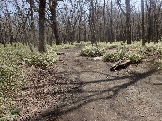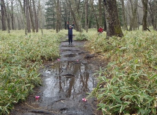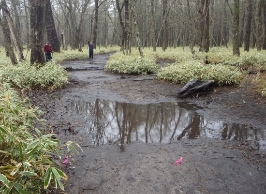 森林の中に作った迂回路は、人が歩くことで生じる踏圧に弱く、植生は後退し、地面は固くなります。降った雨は地中にしみ込まず、水たまりを作り泥沼のような状態になります。利用される方は泥濘を避けて歩道の端を歩きます(私も同じです)。そのため幅1.5mほどの歩道は、今や大通りのようになってしまいました。