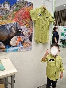 「レンジャーになってみよう !」という企画で、親子連れの来場者約10組が子ども用レンジャー服を試着し、