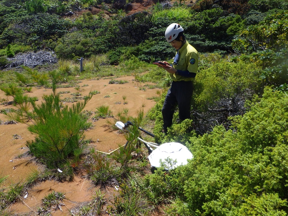 2023年末から地域のNPOである小笠原海洋島研究会が中心となり、研究者 や環境省の協力のもと、オガサワラハンミョウの幼虫の生態の調査が始まっています。調査は、幼虫の巣穴が写るように、長時間の撮影が可能な小型のカメラを設置して、録画データを持ち帰る方法を取っています。2024年の1月から7月に隔月で計4回の調査を実施しています。今回の日記では、5回目となるカメラの設置と回収(8月、9月)で兄島を訪れた際の様子を紹介します。