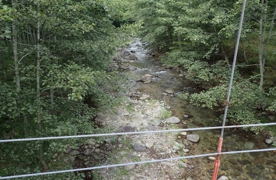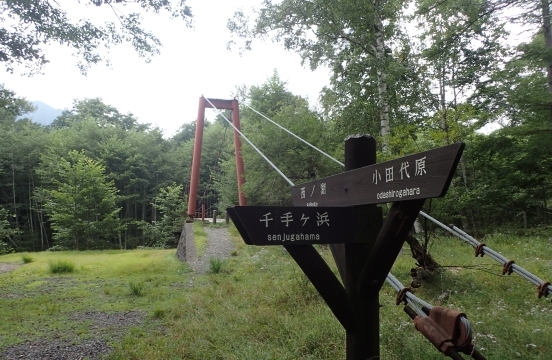 橋の下を流れる川は、水量が豊かで透明度の高い水です。この吊橋を渡り先へ進むと西ノ湖に着きます。