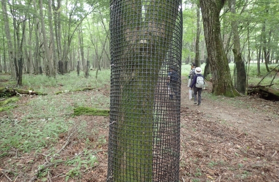 奥日光の樹木はこのようなネットで守られています。シカは食べられる植物が少なくなると、樹木の樹皮も食べてしまいます。樹木は、樹皮に近い所に水分や栄養を運ぶ組織があるため、樹皮を食べられてしまった樹木は枯れてしまいます。千手の森も例外ではありません。