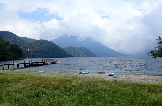 森を通り抜けると、千手ヶ浜に出ます。頂上が雲に隠れていますが、正面には男体山が見えます。