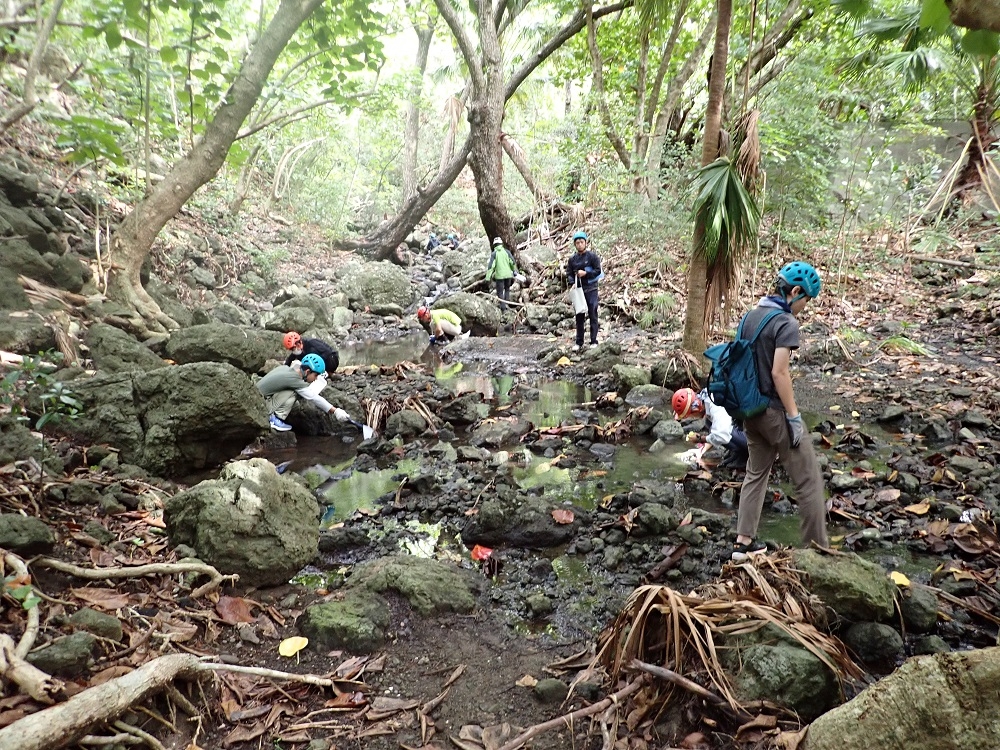 午前中は、小笠原諸島森林生態系保全センターによる植生調査に関する授業、自然環境研究センターによる陸産貝類の授業が行われました。人為的に開発されたエリアから植生遷移が進んでいるエリアでコドラート調査実習や、兄島でしか見ることができない固有の陸産貝類の観察を通して、フィールドならではの貴重な経験を積んでいました。