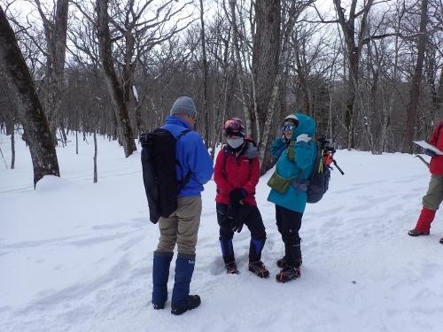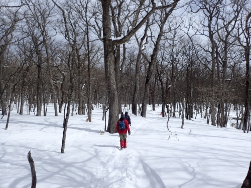 写真では分かりにくいのですが、木道の縁の部分に雪庇(雪が外側にはみ出して積もっています。)ができています。歩道外と雪でつながってしまうので、どこが歩道か分からない箇所もあります。踏み外さないように注意が必要です。