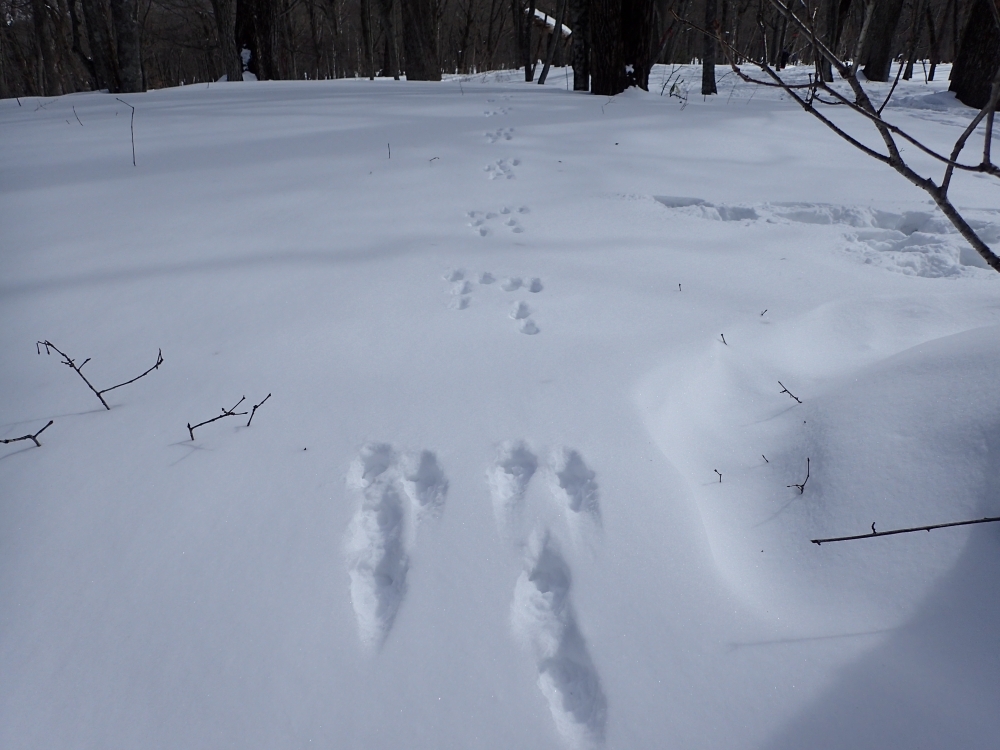 ウサギの足跡は珍しいものではありません。でも見てください、2羽の足跡がきれいに並び、写真手前から奥に向かってまったく同じ間隔で進んでいます。これには私も思わず「可愛い」と声が出ました。