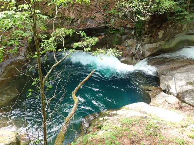 こうした断崖絶壁にロープでぶら下がって手作業で道をつくるといった、過去に信じ難い苦労で開発がなされ、現在気軽に渓谷歩きを楽しむことができるようになっています。