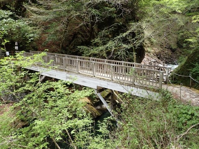 左岸側(下流を向いて左側)ではかなり水に近いところを歩きます。道が狭くすれ違いが難しい場所や、濡れて滑りやすくなっている箇所もありますので、歩きやすい登山靴やトレッキングシューズが必要です。