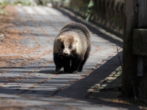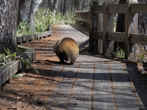 スタートからしばらく歩いた先で、木道上を何かがこっちへやってきました。