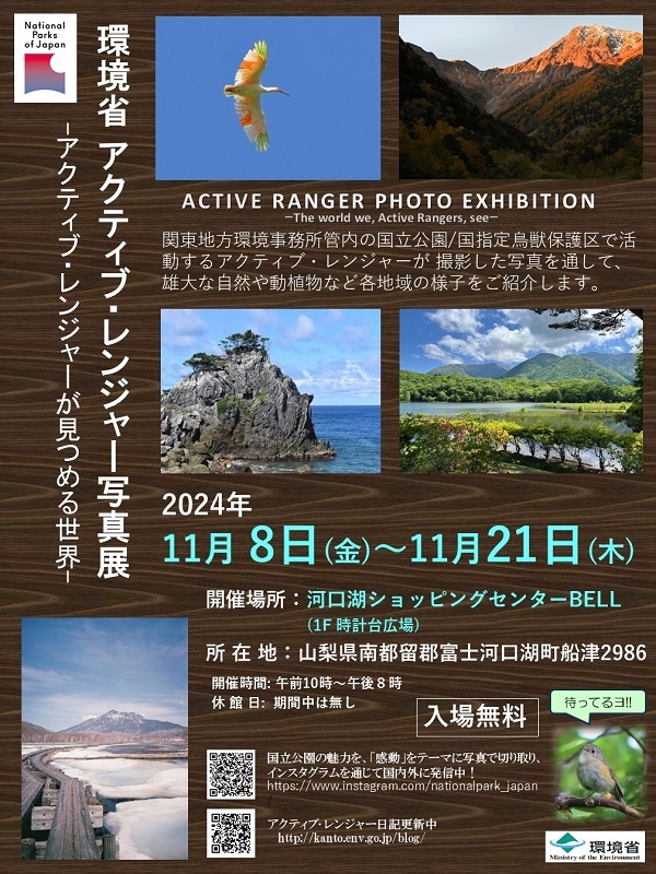 関東地方環境事務所管内には、6つの国立公園、15の国指定鳥獣保護区があります。それらの地区に配置された環境省職員「アクティブ・レンジャー」が日々の業務で撮影した一コマをご紹介します。また富士五湖の個別展示として富士北麓の自然や景観、環境省 富士五湖での活動のご紹介なども展示しています。